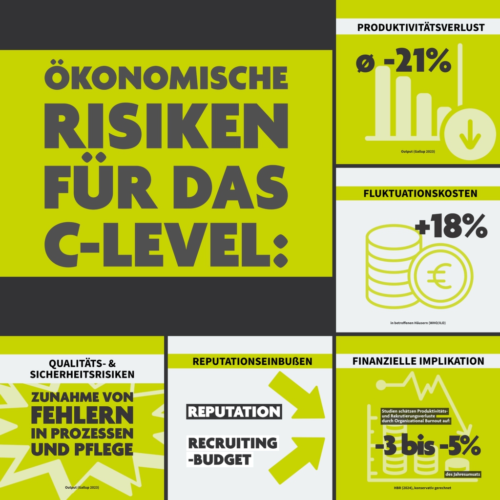 Für Entscheider auf C-Level bedeutet das: Organizational Burnout bedroht nicht nur die Gesundheit der Mitarbeitenden, sondern auch die ökonomische Leistungsfähigkeit und die Patientensicherheit.